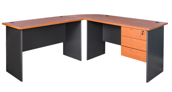 Escritorio Modular (3 segmentos) de lados 180 X 180 cm. terminación redonda. Esta construido en melamina de alta presión de 25 mm. de gran resistencia y durabilidad. El mueble también cuenta con perforaciones especiales para cables. Incluye Cajonera con rieles, tiradores metálicos y llaves.